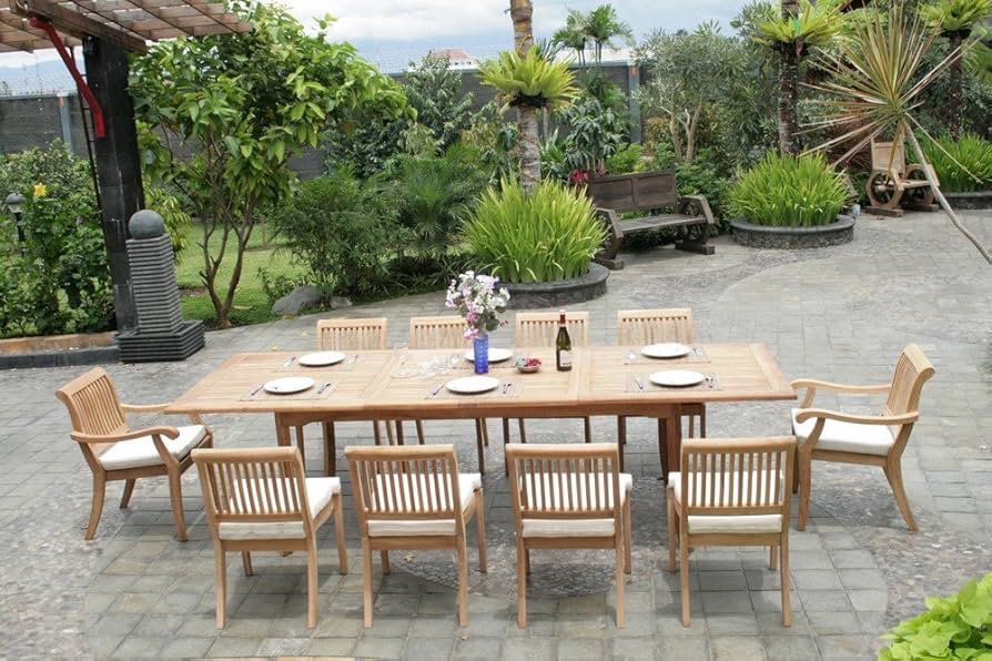 A traditional teak rectangular dining set often includes a large table paired with six to eight chairs. This type of set is perfect for large families or those who frequently host outdoor gatherings. The robust build ensures stability, and its size provides ample room for meals, drinks, and decorative centerpieces.