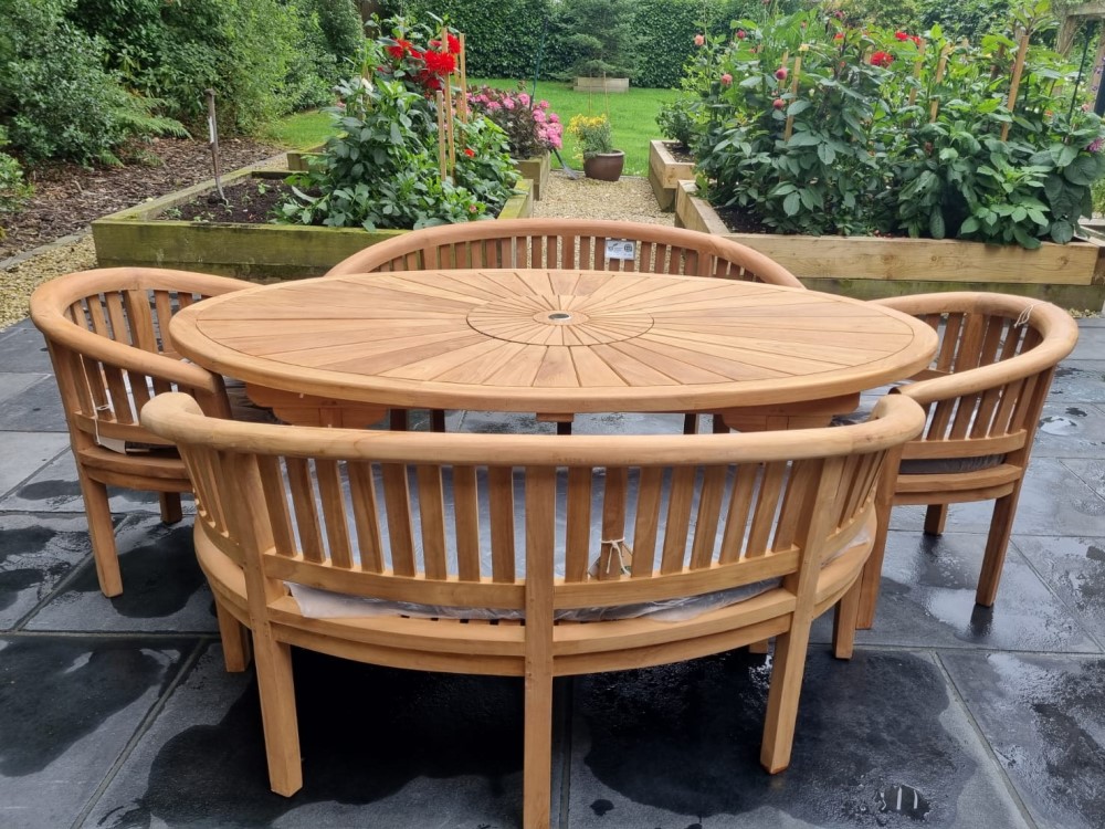 For those who prefer a more intimate dining experience, a round teak dining set is an excellent choice. Typically seating four to six people, the circular design encourages conversation and creates a cozy, inviting atmosphere.